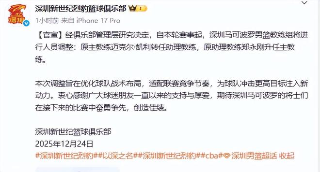CBA新赛季仅打五轮,第一个下课的主教练出炉了。没错,这就是深圳队的洋帅迈克尔.凯利已降为助理教练。今天上午深圳新世纪篮球俱乐部宣布,经俱乐部管理层研究决定,自本轮赛事起,深圳马可波罗男篮教练组将进行人员调整:原主教练迈克尔.凯利转任助理教练,原助理教练郑永刚升任主教练。