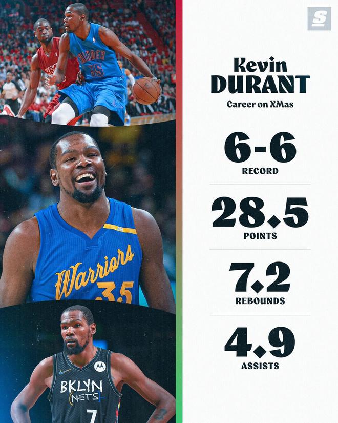 杜兰特圣诞大战6胜6负,场均能得到27.2分6.9板4.4助