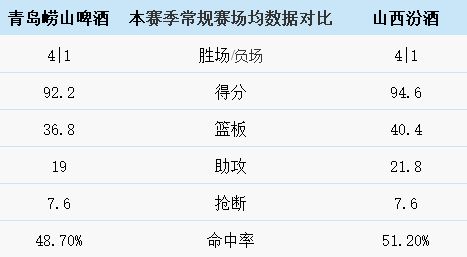 主要球员数据青岛崂山啤酒韦瑟斯庞:本赛季常规赛出战5场,场均上场20.8分钟,得到24.4分、4.2个篮板、5.8次助攻、1.0次抢断。米奇:本赛季常规赛出战5场,场均上场27.6分钟,得到19.6分、8.4个篮板、1.4次助攻、1.2次抢断、1.4次盖帽。王睿泽:本赛季常规赛出战5场,场均上场30.8分钟,得到10.2分、3.2个篮板、1.8次助攻。山西汾酒迪亚洛:本赛季常规赛出战5场,场均上场23.6分钟,得到18.0分、4.0个篮板、4.6次助攻、1.8次抢断和1.8次盖帽。贾明儒:本赛季常规赛出战4场,场均上场25.3分钟,得到15.5分、3.3个篮板、3.5次助攻。焦海龙:本赛季常规赛出战5场,场均上场27.8分钟,得到12.8分、4.8个篮板。里程碑数据约瑟夫·杨CBA生涯总得分6170分,位列CBA历史得分榜第40位,距离第39位的李根(6348分)还差178分。王奕博CBA生涯助攻数1173次,位列CBA历史助攻榜第44位,距离第43位的林庭谦(1174次)还差1次。约瑟夫·杨CBA生涯助攻数1148次,位列CBA历史助攻榜第48位,距离第47位的姜伟泽(1153次)还差5次。