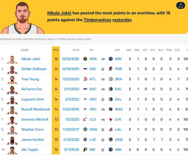 - NBA | 前无古人,约基奇加时3中3&11罚10中得18分,创NBA加时赛得分新高
