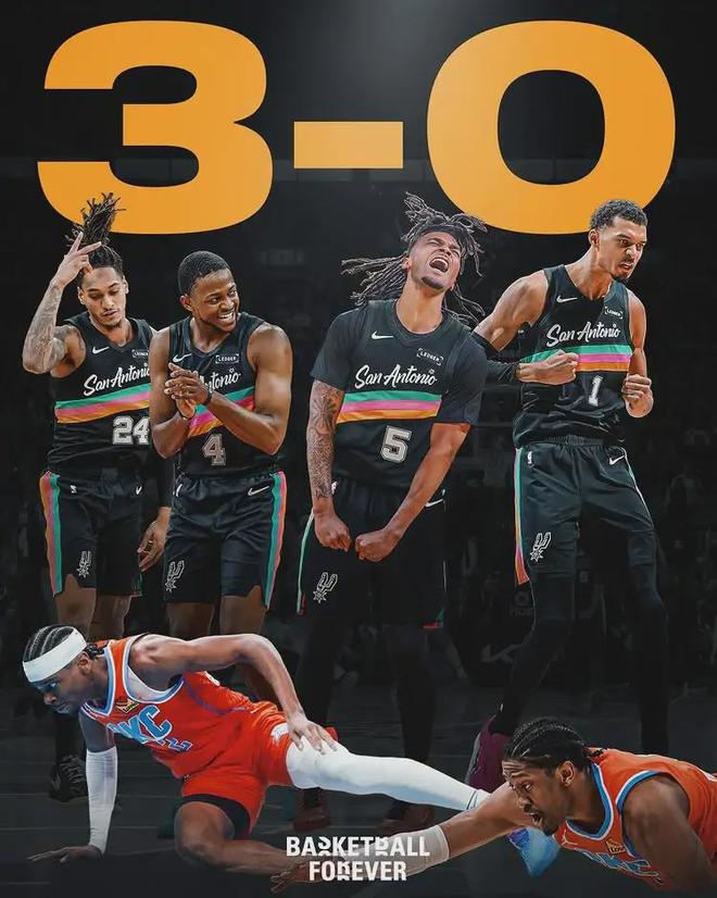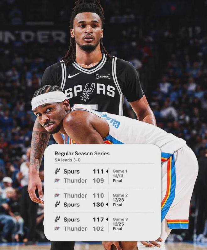 单赛季3比0雷霆,马刺上一次做到这一点还是略显遥远的2010-11赛季,双方本赛季常规赛最后一次交锋,在2026年1月14日。篮君好期待那一天,看看雷霆能不能扳回一局。