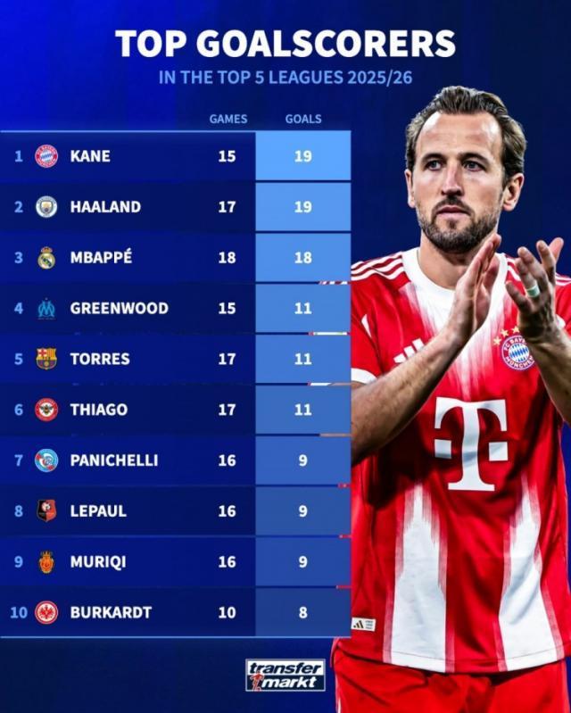 德国转会市场列出了本赛季五大联赛射手榜,凯恩、哈兰德19球居首。本赛季五大联赛射手榜:凯恩(拜仁)——15场19球哈兰德(曼城)——17场19球姆巴佩(皇马)——18场18球格林伍德(马赛)——15场11球费兰(巴萨)——17场11球伊戈尔·蒂亚戈(布伦特福德)——17场11球帕尼切利(斯特拉斯堡)——16场9球勒波尔(雷恩)——16场9球穆里奇(马洛卡)——16场9球伯卡特(法兰克福)——10场8球今日(12.27)08:30 NBA常规赛 76人 - 公牛09:00 NBA常规赛 雄鹿 - 灰熊09:00 NBA常规赛 太阳 - 鹈鹕10:00 世界网球洲际对抗赛 科博利 - 张之臻10:30 NBA常规赛 活塞 - 爵士11:00 NBA常规赛 快船 - 开拓者11:45 世界网球洲际对抗赛 斯瓦泰克 - 王欣瑜17:00 德杯八强赛 JDG - EDG19:30 意甲第17轮 帕尔马 - 佛罗伦萨19:30 CBSA斯诺克苏州表演赛 赵心童 - 傅家俊19:35 CBA常规赛 北控 - 辽宁19:35 CBA常规赛 上海 - 四川19:35 CBA常规赛 广厦 - 深圳19:45 湘超决赛 永州队 - 常德队20:30 非洲杯小组赛D组第2轮 贝宁 - 博茨瓦纳20:30 英超第18轮 诺丁汉森林 - 曼城21:30 CBA潜力赛 广厦 - 深圳21:30 CBA潜力赛 上海 - 四川22:00 意甲第17轮 莱切 - 科莫22:00 意甲第17轮 都灵 - 卡利亚里22:50 沙特联第11轮 利雅得胜利 - 阿科多23:00 非洲杯小组赛D组第2轮 塞内加尔 - 民主刚果23:00 英超第18轮 阿森纳 - 布莱顿23:00 英超第18轮 布伦特福德 - 伯恩茅斯23:00 英超第18轮 伯恩利 - 埃弗顿23:00 英超第18轮 利物浦 - 狼队23:00 英超第18轮 西汉姆联 - 富勒姆明晨(12.28)01:00 意甲第17轮 乌迪内斯 - 拉齐奥01:30 非洲杯小组赛C组第2轮 乌干达 - 坦桑尼亚01:30 沙特联第11轮 吉达联合 - 利雅得青年人01:30 英超第18轮 切尔西 - 阿斯顿维拉03:45 意甲第17轮 比萨 - 尤文图斯04:00 非洲杯小组赛C组第2轮 尼日利亚 - 突尼斯06:00 NBA常规赛 独行侠 - 国王以上内容请关注首页JRS