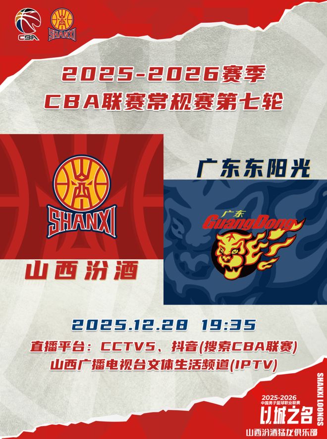 北京时间2025年12月28日19:35,2025-2026赛季CBA联赛常规赛第七轮继续进行,山西汾酒坐镇主场,迎战广东东阳光,球迷观众可以通过CCTV5、央视频、抖音(搜索CBA联赛)、山西广播电视台文体生活频道(IPTV)观看比赛实况,敬请期待!