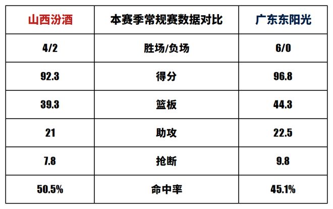 山西汾酒:迪亚洛:本赛季常规赛出战6场,场均上场23.7分钟,得到18.7分、4.0个篮板、4.5次助攻、1.8次抢断、1.5次盖帽。贾明儒:本赛季常规赛出战5场,场均上场25.8分钟,得到15.4分、3.0个篮板、3.6次助攻。诺威尔:本赛季常规赛出战6场,场均上场20.7分钟,得到14.8分、3.0个篮板、2.2次助攻。广东东阳光:萨姆纳:本赛季常规赛出战6场,场均上场23.5分钟,得到20.7分、3.0个篮板、3.5次助攻、1.2次抢断。萨林杰:本赛季常规赛出战6场,场均上场25.7分钟,得到18.0分、9.7个篮板、2.5次助攻、1.7次抢断1.7次抢断、1.0次盖帽。徐杰:本赛季常规赛出战6场,场均上场31.0分钟,得到16.2分、3.3个篮板、6.0次助攻、1.2次抢断。以上内容请关注首页JRS