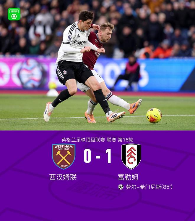 北京时间12月27日,英格兰足球超级联赛第18轮,西汉姆联坐镇主场迎战富勒姆。比赛中,斯卡莱斯解围踢空,哈里-威尔逊助攻劳尔-希门尼斯头槌绝杀。凭借此球,富勒姆客场1比0战胜西汉姆联。关键事件第85分钟,斯卡莱斯解围踢空,哈里-威尔逊助攻劳尔-希门尼斯头槌破门,富勒姆1-0!