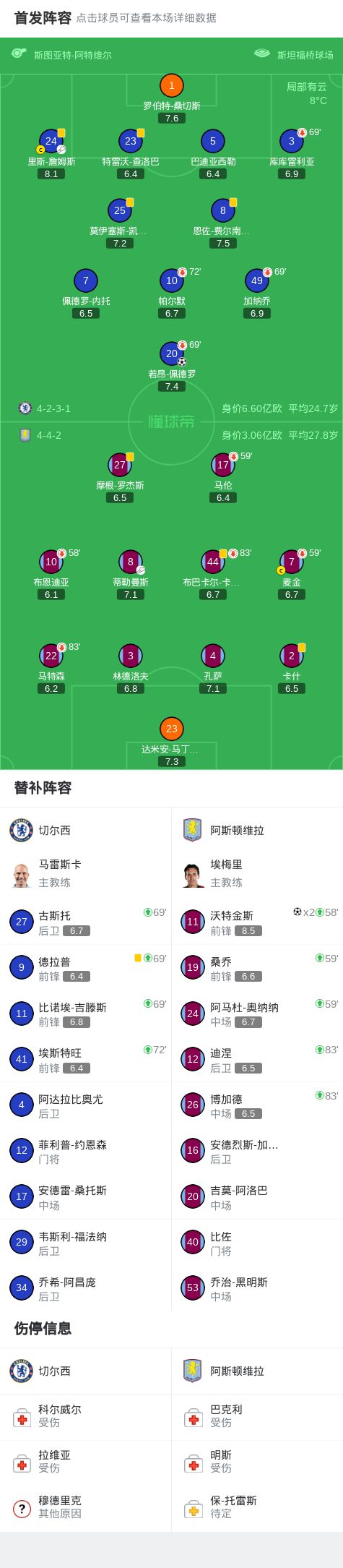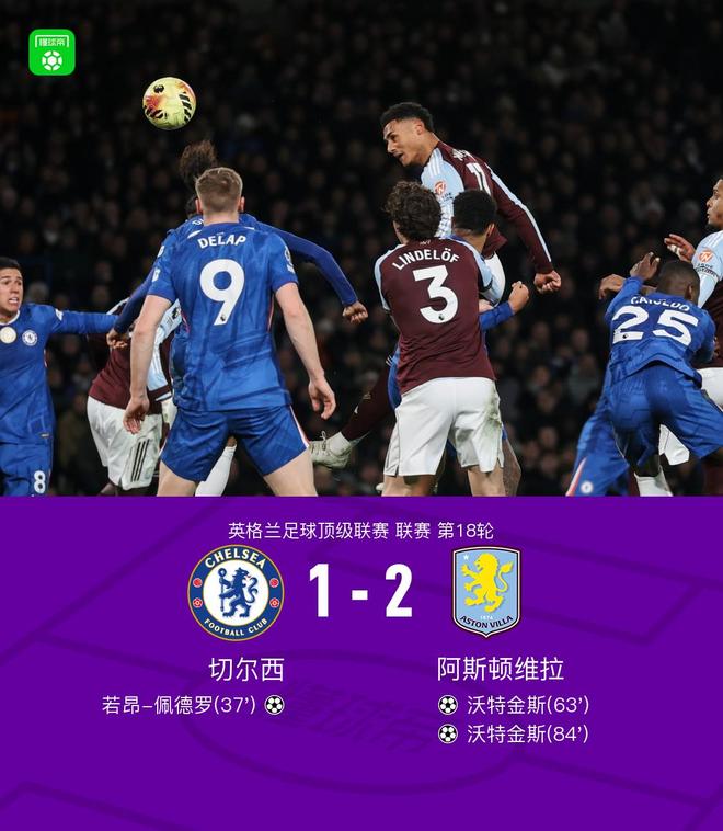 剑南春切尔西12维拉,沃特金斯双响,佩德罗破门,马特森逃点