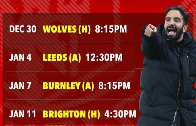 在周末1-2输给利物浦的比赛中,安德烈获得了本赛季第5张黄牌,根据英超规则,这意味着他将在对阵曼联的比赛中被禁赛一场。这对狼队而言可谓屋漏偏逢连夜雨,目前他们仅有2分排名积分榜的最后一位,而且在这个赛季中,爱德华兹的球队至今仍未取得过一场胜利。虽然曼联本赛季状态起伏,然而主场面对如此低迷而且缺兵少将的狼队,取胜仍然被认为是不在话下。曼联不久前才在客场4-1大破狼队,取得阿莫林执教后最大比分的英超胜利。不仅如此,在1-0击败了纽卡斯尔联之后,红魔迎来了一段美好的赛程,不只是狼队,接下来连续几个对手的实力都不太强。主场与狼队的比赛后,曼联将在2026年的第一战做客升班马利兹联,后者只排名第16位。接下来的对手则是伯恩利,虽然也是客场,但「红酒军团」排名联赛倒数第二,也是著名的送分童子。也就是说,接下来3场比赛,曼联的对手都排在积分榜最后5位,这是阿莫林豪取执教以来首次四连胜的最佳机会!如果算上足总杯第三轮主场对布莱顿(英超第13位)的比赛,在1月中旬迎战曼城的同城德比之前,球队有机会实现各项赛事五连胜,让球迷过个好年。
