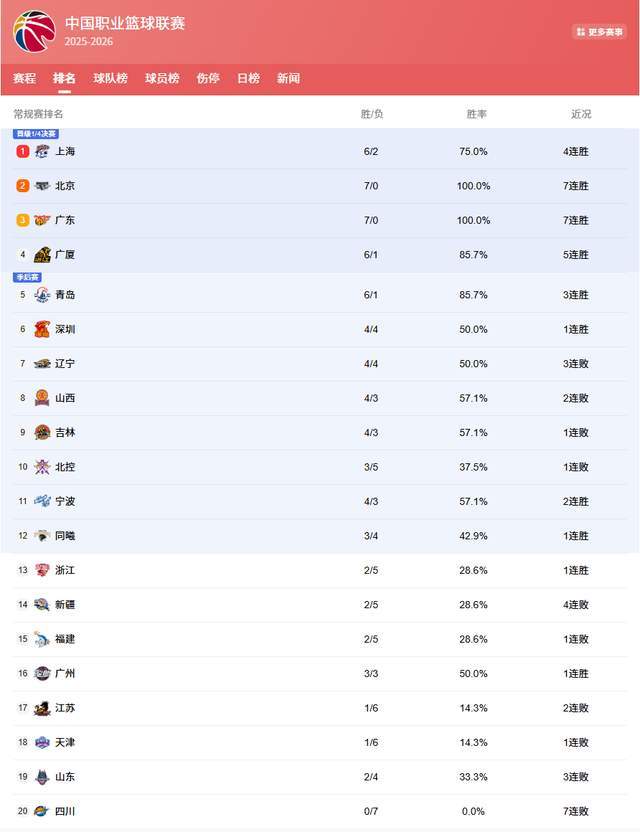 随着此役落败,辽宁男篮吞下3连败,战绩也变成4胜4负,排名继续下滑,已经掉出前6名,直接来到第7位。目前积分榜前六中,浙江广厦、北京首钢、广东男篮被视为真正的争冠热门。广厦虽爆冷负于辽宁,但整体实力仍属顶级;北京首钢和广东男篮均以7胜0负领跑,且尚未集结最强阵容——北京队的曾凡博仍未登场,广东队的崔永熙和麦考尔尚未回归。若这两支球队完成阵容磨合,CBA格局恐将迎来新一轮洗牌。