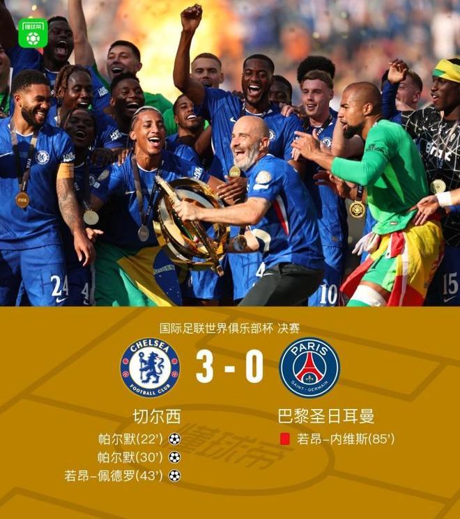 世俱杯决赛在美国新泽西州大都会人寿体育场展开角逐,切尔西对阵巴黎圣日耳曼,本场主裁判为法加尼(澳大利亚)。上半场,帕尔默天神下凡推射梅开二度后又助攻若昂-佩德罗挑射破门。下半场,若昂-内维斯拽库库雷利亚头发被直红罚下。最终,切尔西3-0完胜巴黎,夺改制后世俱杯首冠!