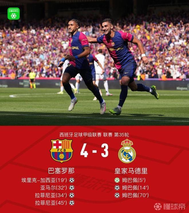 比赛中,皇家马德里的姆巴佩表现出色,通过点球首开纪录后又连入两球,完成帽子戏法。巴塞罗那方面,埃里克-加西亚率先为球队扳回一城,随后亚马尔建功将比分追平。拉菲尼亚则在比赛中梅开二度,为巴塞罗那锁定胜局。最终,巴塞罗那以4-3战胜皇家马德里,全赛季四杀皇马。