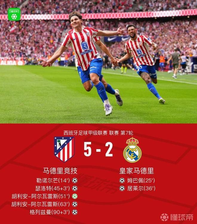 马德里竞技勒诺尔芒率先头球破门,居莱尔助攻姆巴佩扳平,随后居莱尔抽射反超比分。上半场补时阶段瑟洛特绝平。下半场,胡利安-阿尔瓦雷斯点射+任意球破门完成梅开二度,格列兹曼比赛最后时刻破门。最终比分马竞 5-2 皇马。皇马吞下许久未见的五粒丢球。马竞和西蒙尼救赎了这个赛季,也救赎了自己。而西蒙尼的帅位由此彻底稳固。