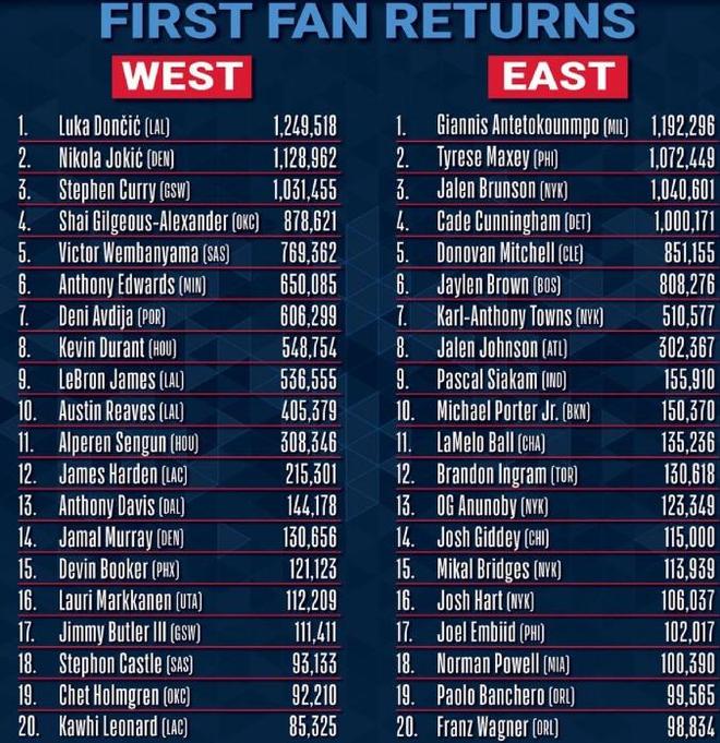 - NBA | 全明星首轮投票结果出炉:东契奇暂列票王詹杜排名下降库里上升
