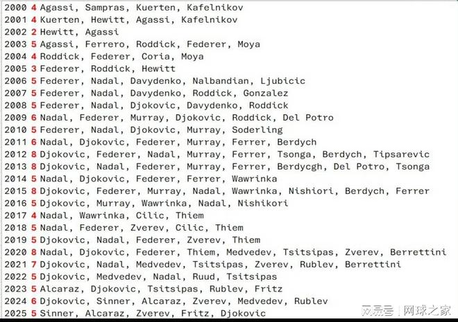 今年是2025年的最后一天,回顾这一年,有新人进入了世界前十,也有人从赛季开始到结束都矗立在前十行列。那么回顾近二十年来的世界前十,谁又是最稳定的球员呢?毫无疑问,费德勒、纳达尔、德约科维奇成为二十年来最稳定球员!