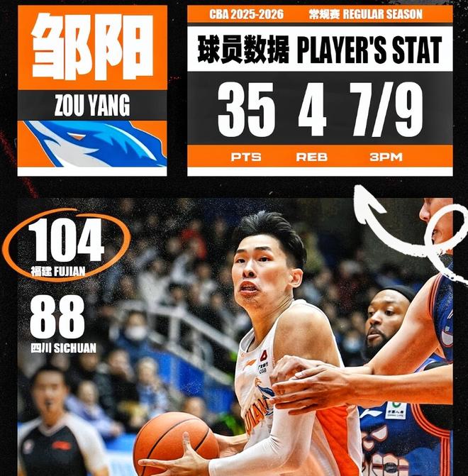 另外一场比赛,福建本轮迎战副班长四川,也拿下了一场轻松的大胜,104-88击败四川,福建斩获2连胜,邹阳打出生涯之夜,出战33分钟17中13,三分9中7轰下全场最高35分4篮板3助攻1抢断,刷新了个人生涯单场最高分。本轮稍早前的2场比赛,上海客场以91-65大胜辽宁,深圳101-105不敌北控。