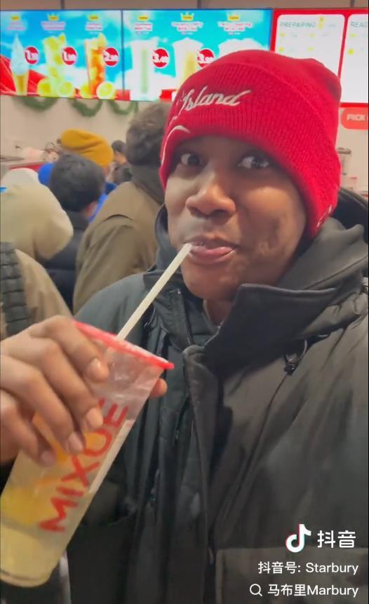 视频显示,马布里点了一杯售价1.99美元的柠檬水,以及一杯茉莉奶绿。他在视频中表示:“我在纽约也能喝到中国的饮品了,这里有1.19美元的冰淇淋、1.99美元的柠檬水,这个价格在纽约是闻所未闻的。”