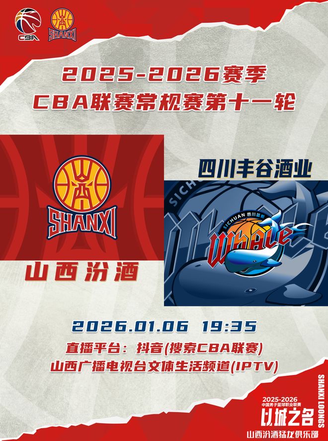 北京时间2026年1月6日19:35,2025-2026赛季CBA联赛常规赛第11轮继续进行,山西汾酒主场迎战四川丰谷酒业。球迷观众可以通过抖音(搜索CBA联赛)、山西广播电视台文体生活频道(IPTV)观看比赛实况,与我们一起闹他!