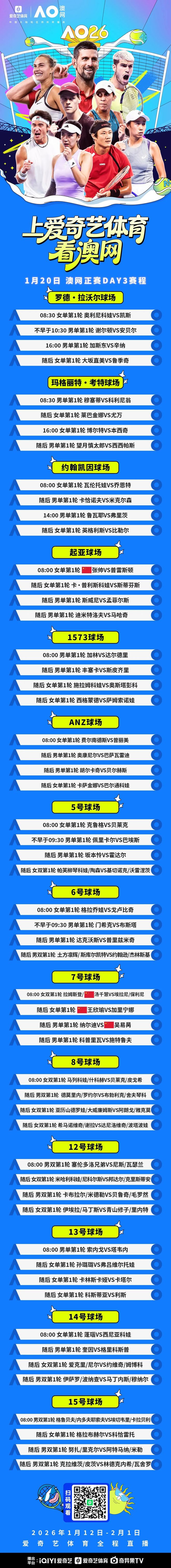 北京时间1月20日,2026澳大利亚网球公开赛第3日比赛将在墨尔本公园全面打响。爱奇艺体育将继续为您全程直播所有精彩对决。